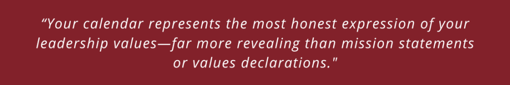 Your calendar represents the most honest expression of your leadership values—far more revealing than mission statements or values declarations. When you examine where your time actually goes, what story does it tell? Does it reflect a leader investing strategically in what matters most, or someone caught in the efficiency trap?